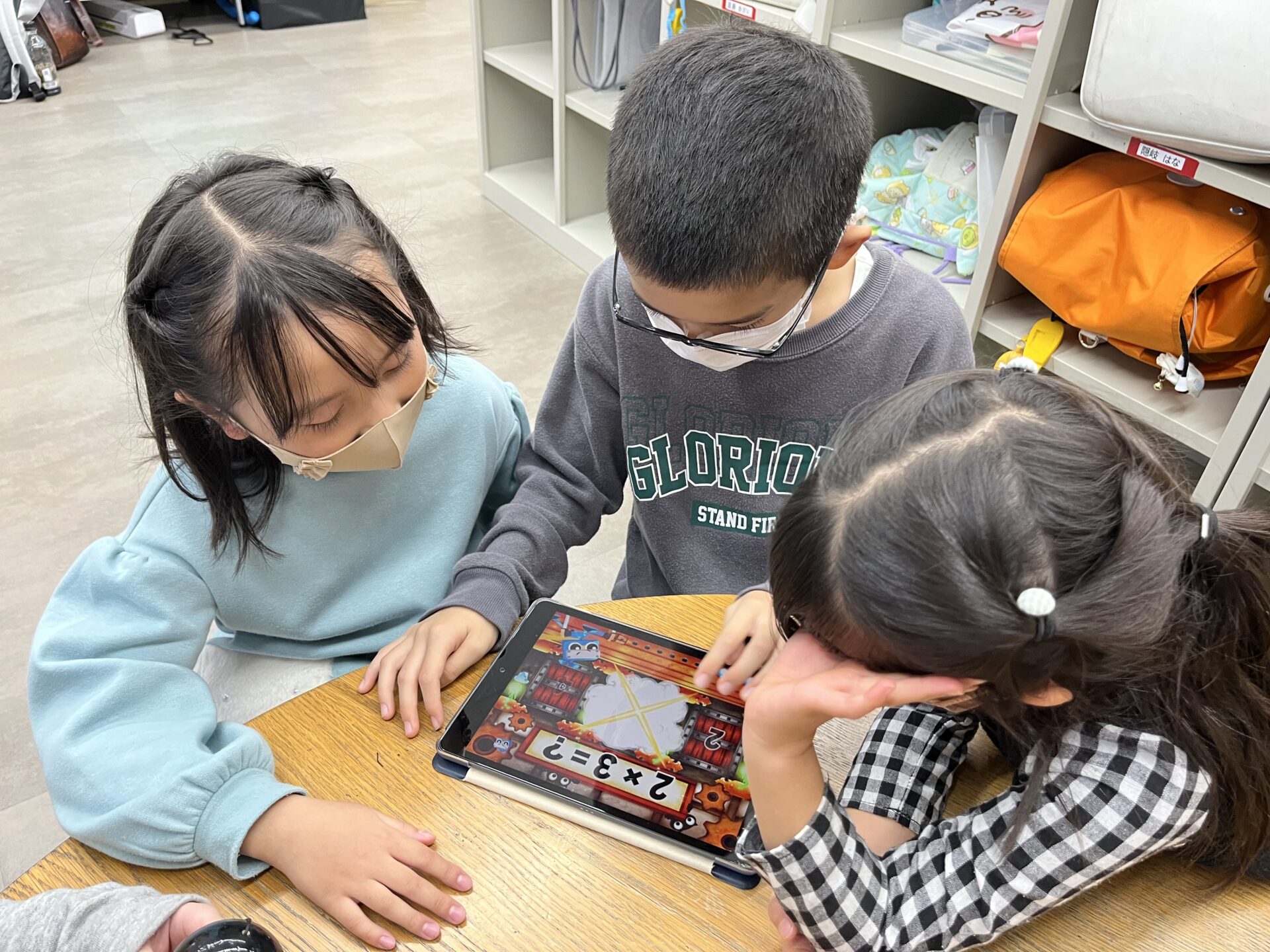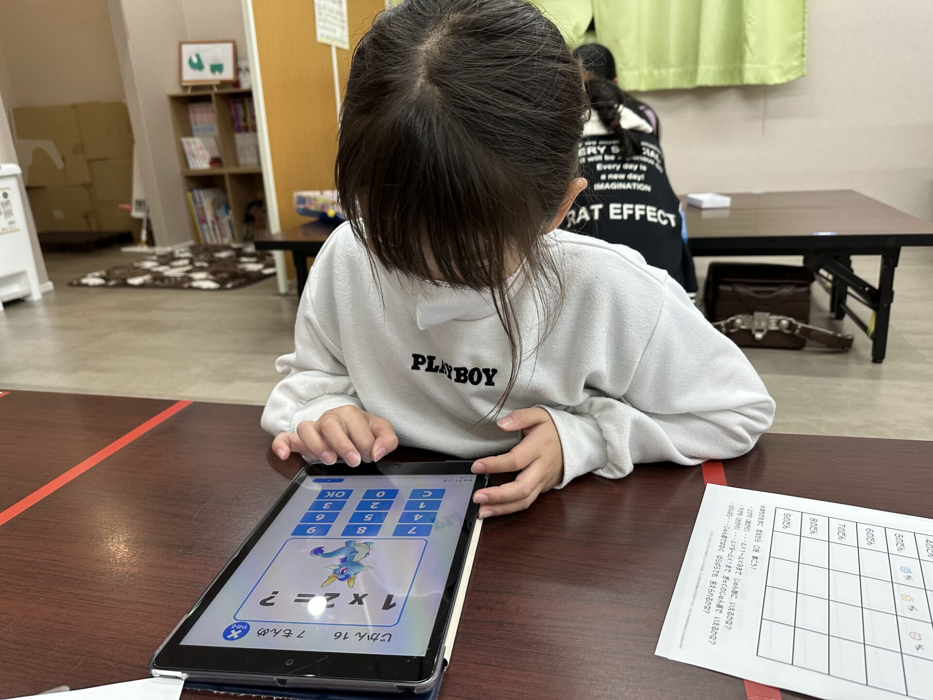 そこで、12月は九九克服月間として、送迎車内とおやつの時間に「九九のうた」を流したり、九九のアプリゲームで、遊びながら九九を覚えています。