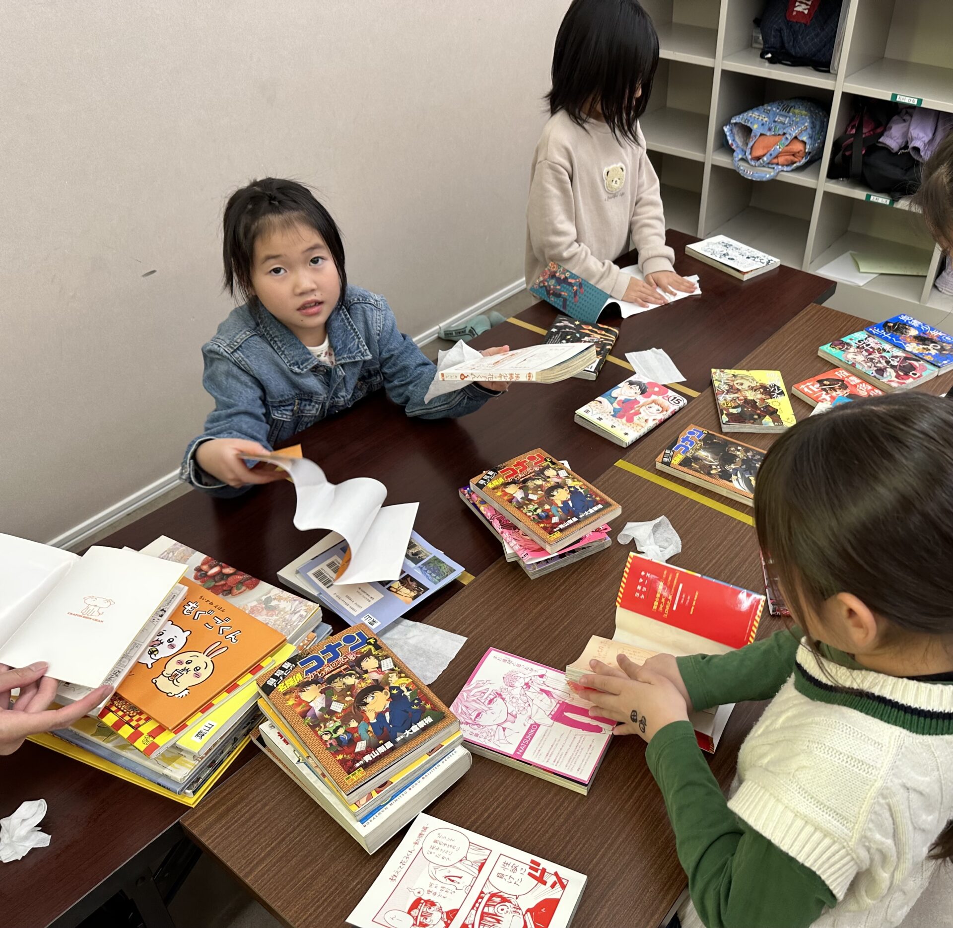 子ども達には、自分のロッカーの整理整頓・本の表紙や保育室の床を除菌シートで拭いてもらいました。